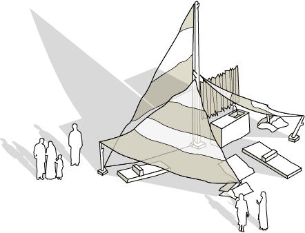 Bayt al-Mahār is a nomadic gathering house, a transient structure developed by artist Megan Cope and designed in collaboration with THIRD SPACE* Studio.